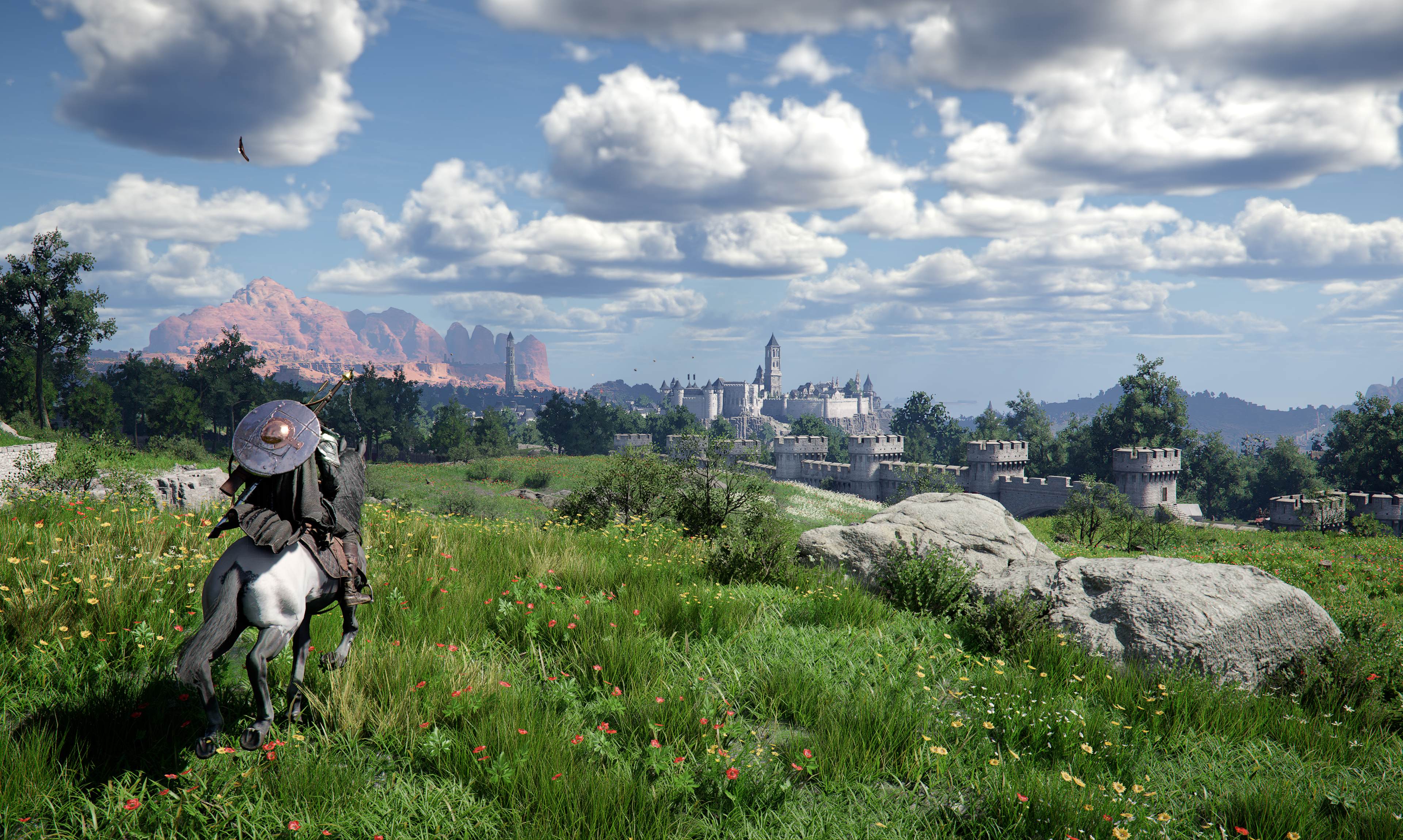 The variety in this world is wild. You’ll find everything from a futuristic feeling in the Abyss "Upper World" filled with puzzles, to jetpacks, pistols, magic, and dragons. For transportation, you’ll mostly use horses, but you can also ride camels, bears, a dragon or even a cow if you feel like it.